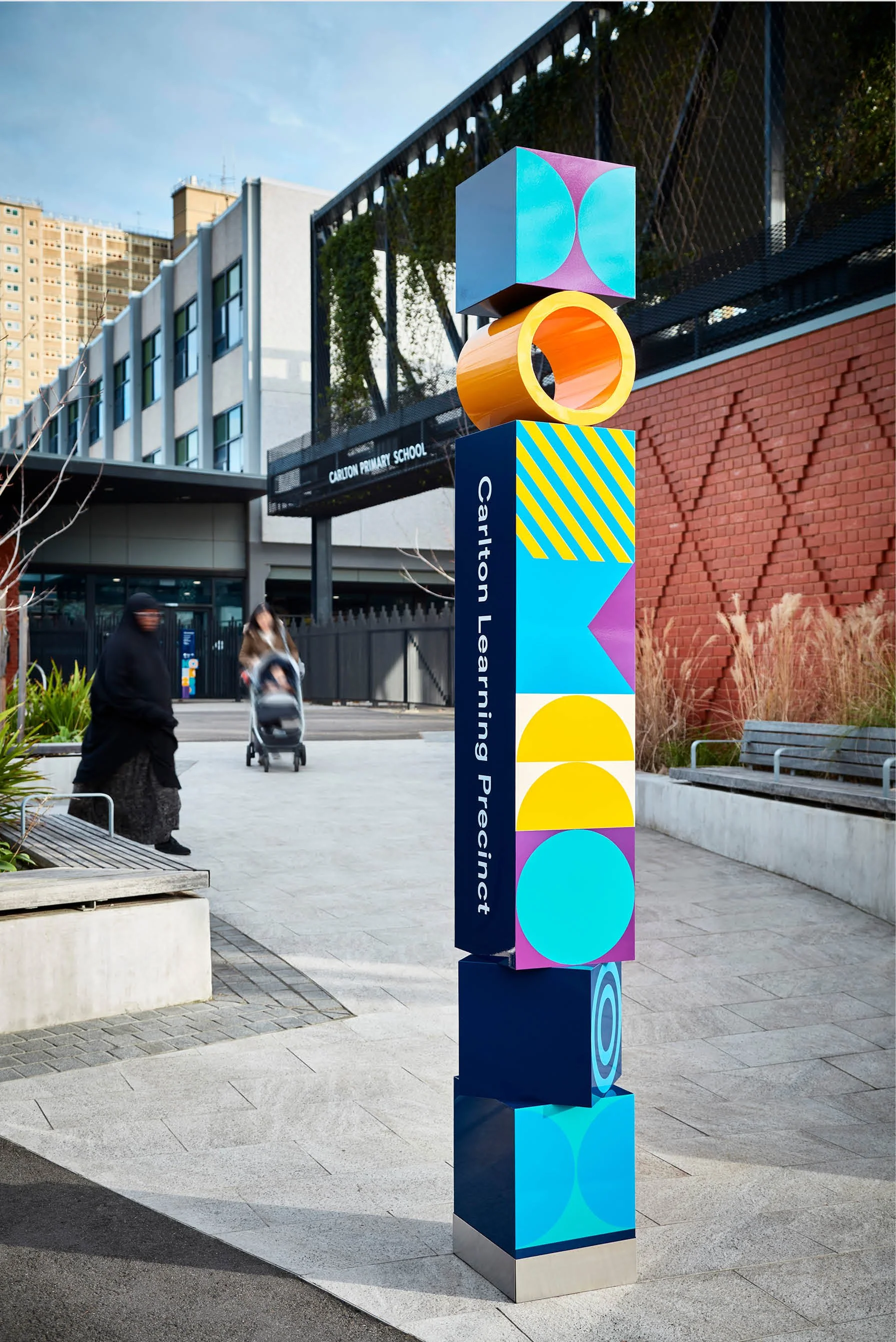 Encapsulating the Carlton Primary School, Family Services and an Early Learning Centre, the Carlton Learning Precinct celebrates inclusion, acceptance, diversity, and fun. Reflecting the values and services of this important community zone, external and internal building identification, signage, and wayfinding prioritises clarity and form to aid user journeys, while its vibrant and playful personality engages and welcomes staff and visitors.