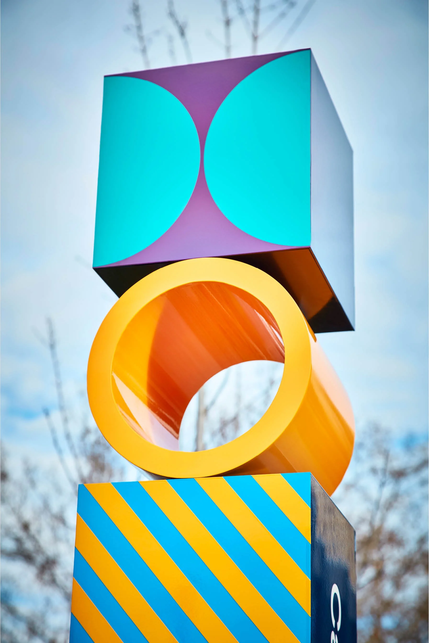 Inspired by the structure and colour found in flags and educational toys, combinations of shape and colour form the core visual identity – whether expressed as three-dimensional street sculpture or slimline internal room identification, these bold, youthful, and engaging solutions provide visual links between public and private spaces and complement the architecture and interior finishes.